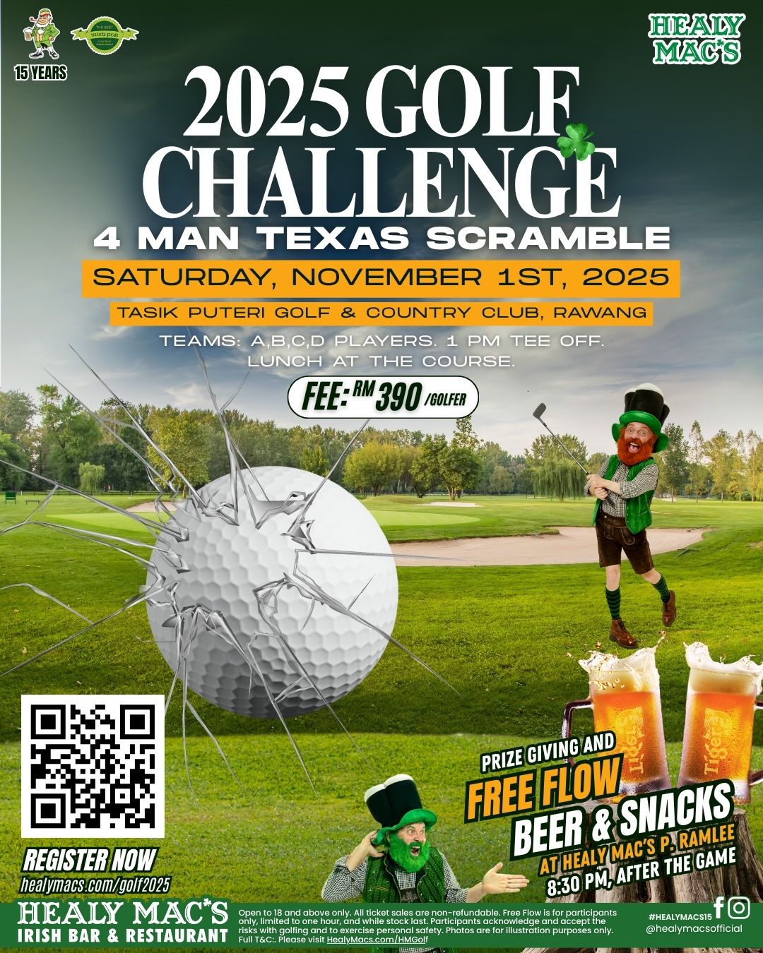 Registration Fee: RM 390 Green fee includes: Golf, Goodie Bag, Lunch, Beers on the course, prize presentation and free-flow beers and snacks at Healy Mac’s P. Ramlee.